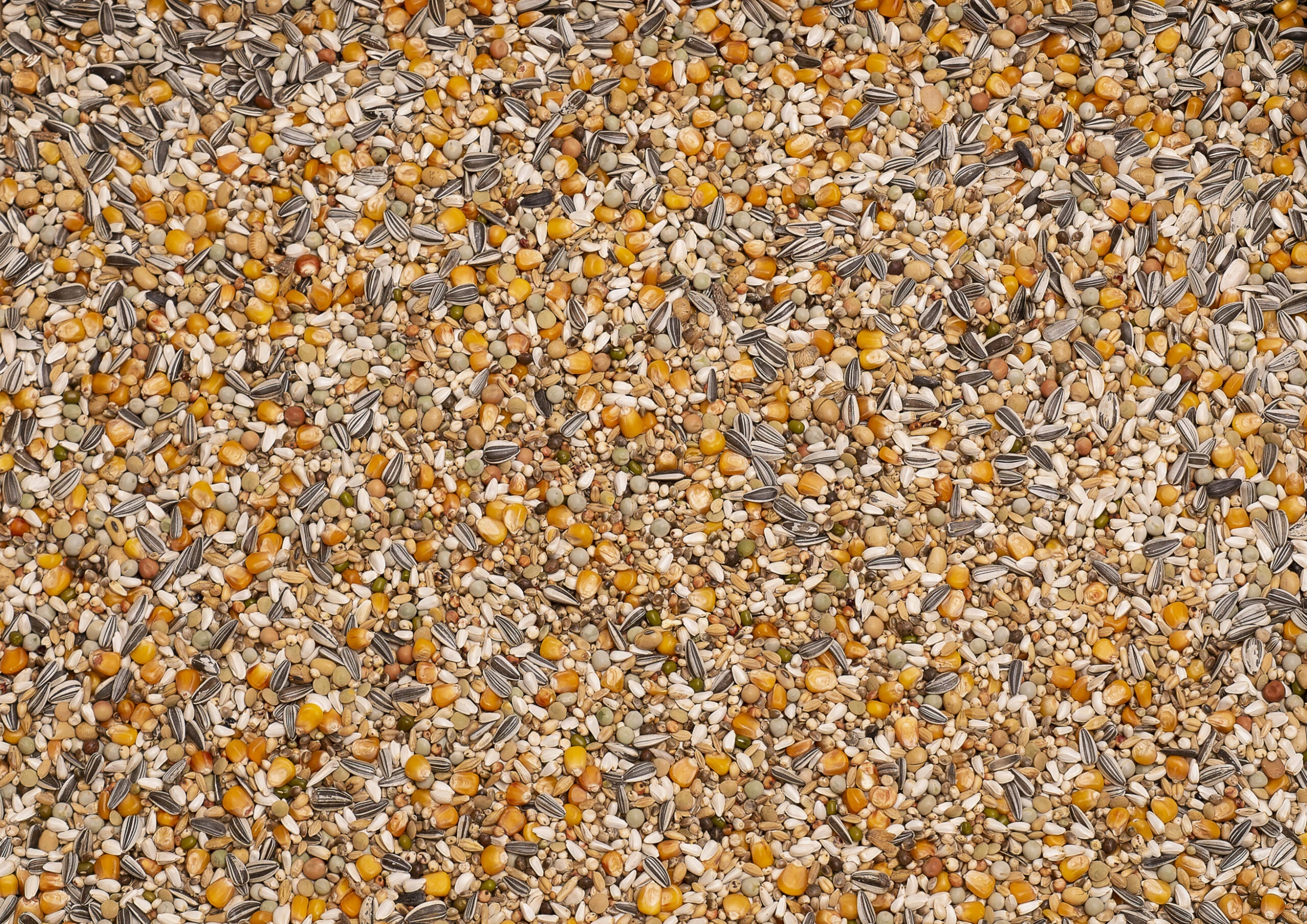 WeiĂer Dari 15%, kleiner Cribbs-Mais 12,5%, Cribbs-Mais 12,5%, Kardi 10%, Hanf 9%, kleine grĂŒne Erbsen 9%, weiĂer Weizen 7%, roter Sorghum 3%, Paddy-Reis 3%, gelber Millet 2%, geschĂ€lter Hafer 2%, Katjang Idjoee 2%, gestreifte Sonnenblumenkerne 2%, getoastete Soja 2%, Wicken 2%, Linsen 2%, Dunpeas 1%, Gerste 1%, Sesam 1%, Kanariensaat 1%, Quinoa 1%